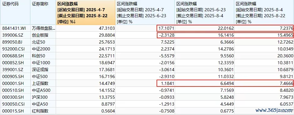 6月23日到8月4日,沪指由3400点涨至3600点,微盘股涨幅仍然超越,但创业板指、中证500等更多指数运转奋起追逐。