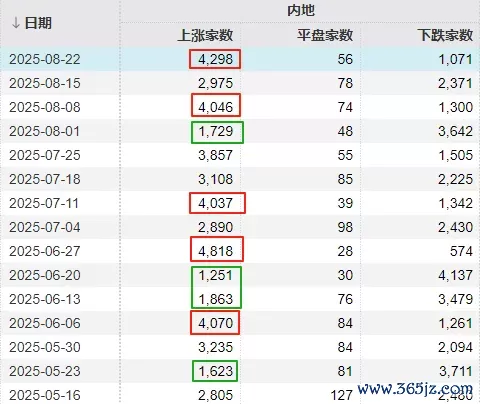如下图所示,在5月上旬沪指站上3300点后,个股表情常常在达到极致(超4000家周度收涨)之后,就会迎来一到两周的落潮期,高潮门户昭彰减少。